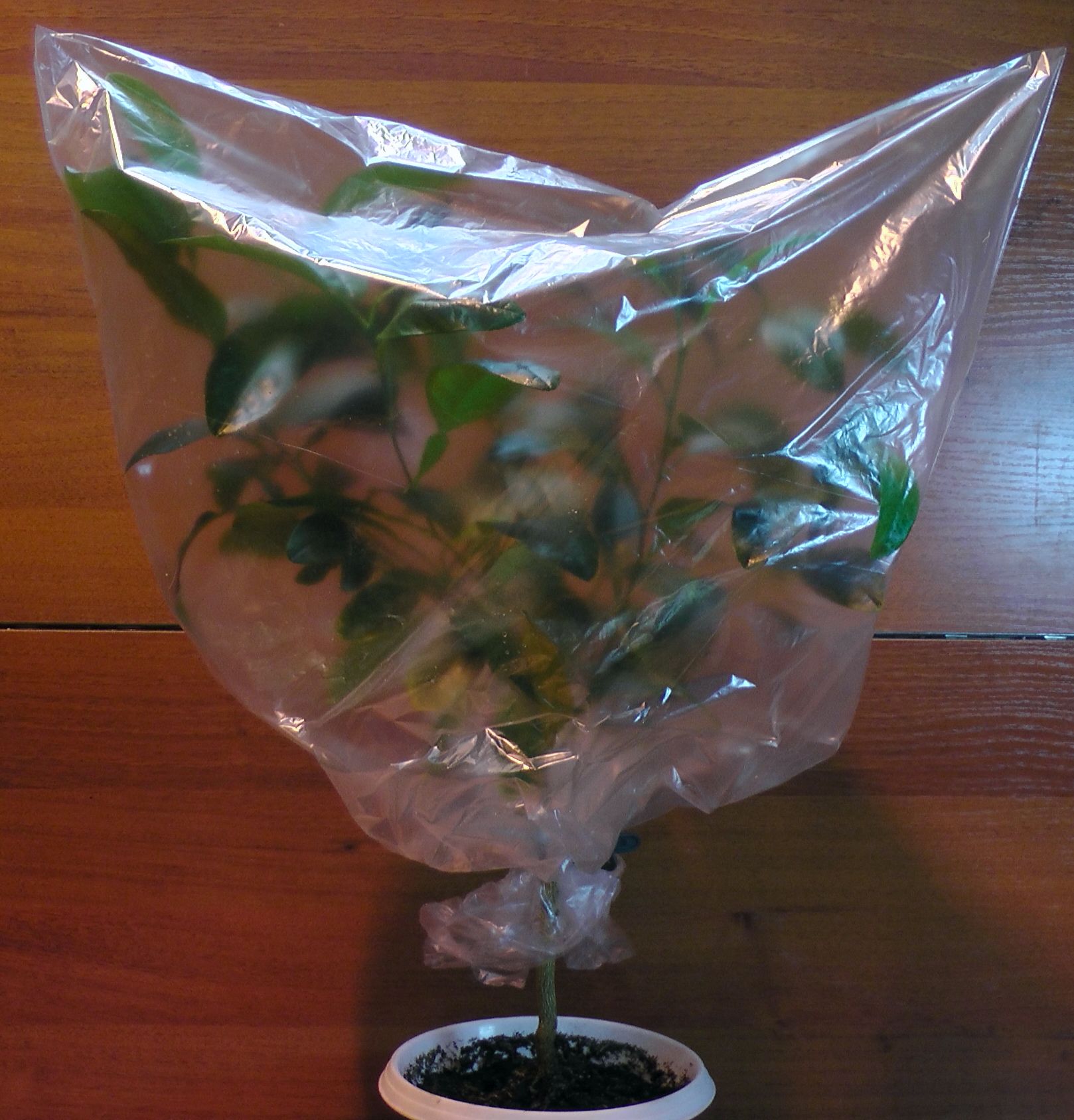После пересадки (особенно со сменой грунта) крону нужно накрыть прозрачным полиэтиленовым пакетом и поставить растение в хорошо освещенное место, но без прямых солнечных лучей. Цитрусы очень любят яркий свет и солнце, но в небольшом замкнутом объеме под пакетом при попадании солнечных лучей слишком быстро и сильно поднимается температура - крона просто "сварится".