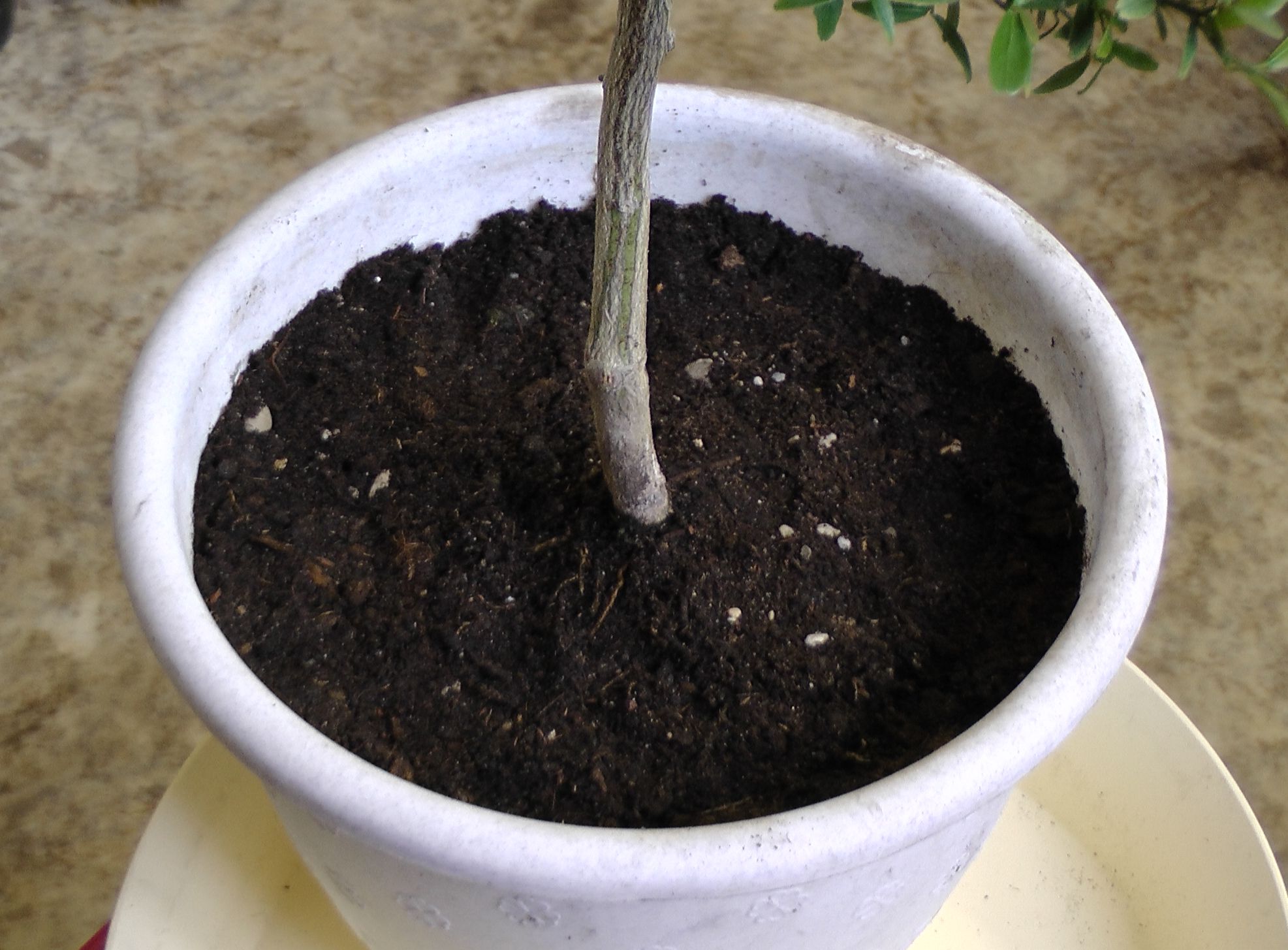 по краям и сверху до корневой шейки насыпьте земляную смесь и хорошо утрамбуйте. Старайтесь сделать это быстро, поскольку корни цитрусов очень быстро пересыхают на воздухе. Трамбовку можно произвести легким постукиванием горшка об пол. При плохом уплотнении свежего грунта в нем могут остаться воздушние пустоты, в которых корни не смогут развиваться. Это может привести к болезни и сбросу листьев. При пересадке не заглубляйте корневую шейку и старайтесь не травмировать корни.