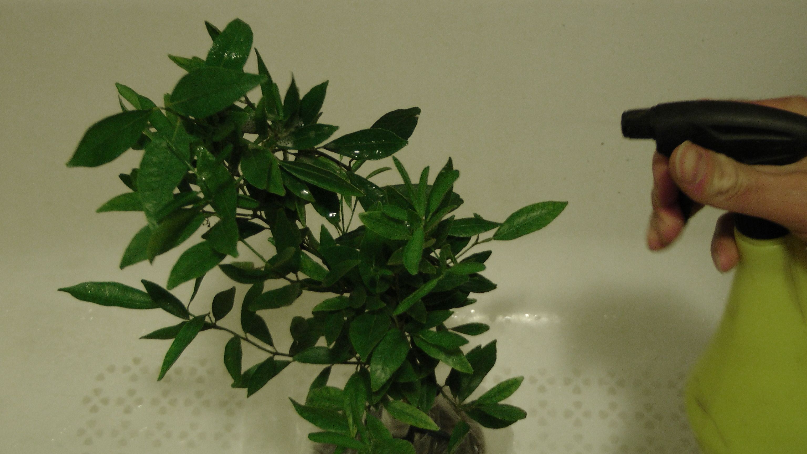 Крона обрабатывается из пульверизатора мыльным раствором (зеленое мыло, жидкое мыло, шампунь или жидкость для мытья посуды, разбавленные водой), который потом тщательно смывается. При сильном загрязнении можно аккуратно потереть листья в руках, стараясь не повредить их, - для лучшего образования пены и очищения обеих сторон листовой пластины (пыль препятствует доступу света и забивает устьица, мешая дыханию и транспирации). Будьте осторожны - у многих цитрусов есть шипы!