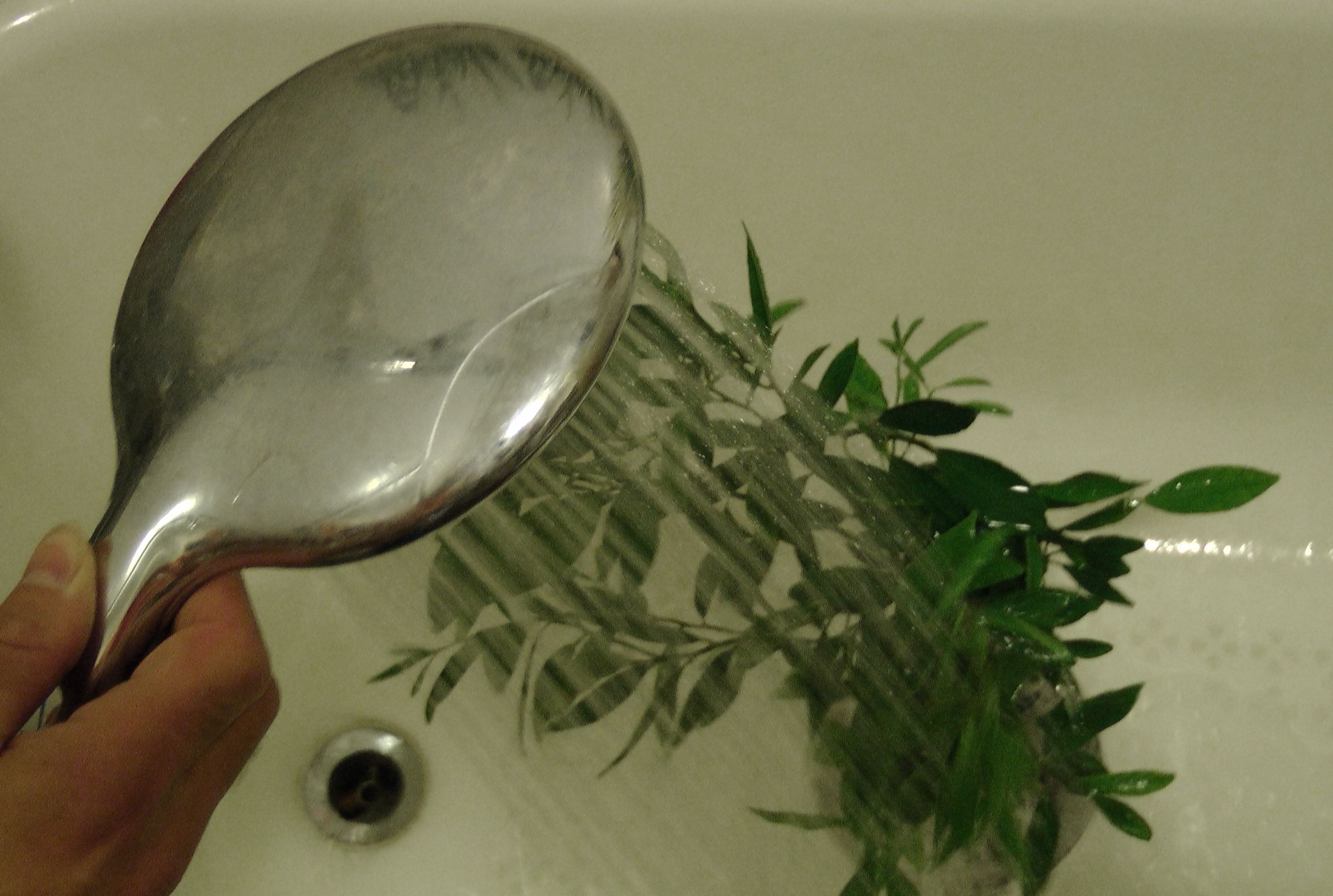 Сильной теплой струей из-под душа удаляется с листьев и веточек не только пыль, но и многие вредители.