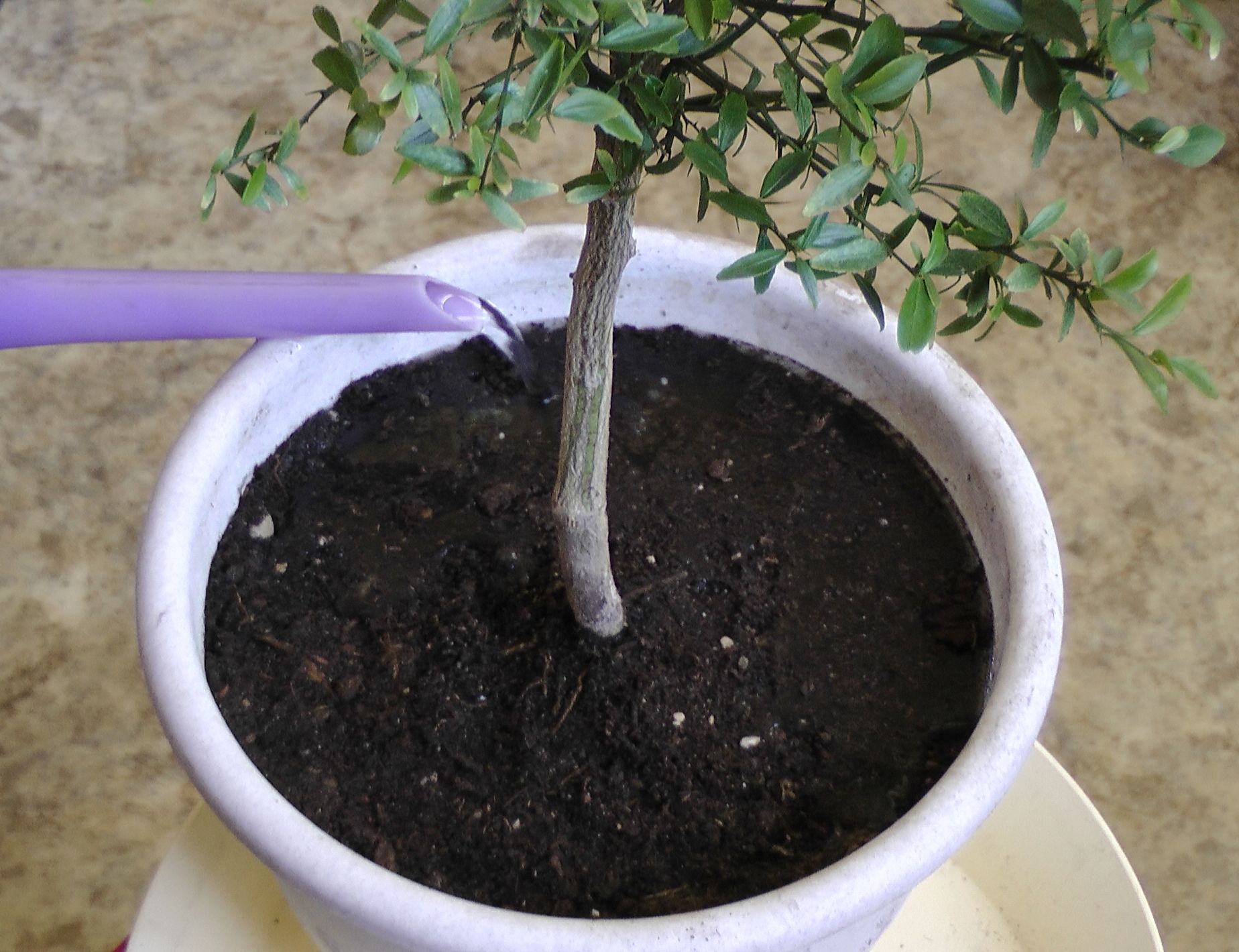 Большинство деревьев предпочитает обильный полив после легкого подсыхания земляного кома, а не частый полив небольшим количеством воды. Цитрусы - не исключение. Поэтому поливайте обильно, стараясь полностью смочить весь земляной ком. Сигналом окончания полива служит вода, выступившая на поддон, через полчаса ее нужно слить.