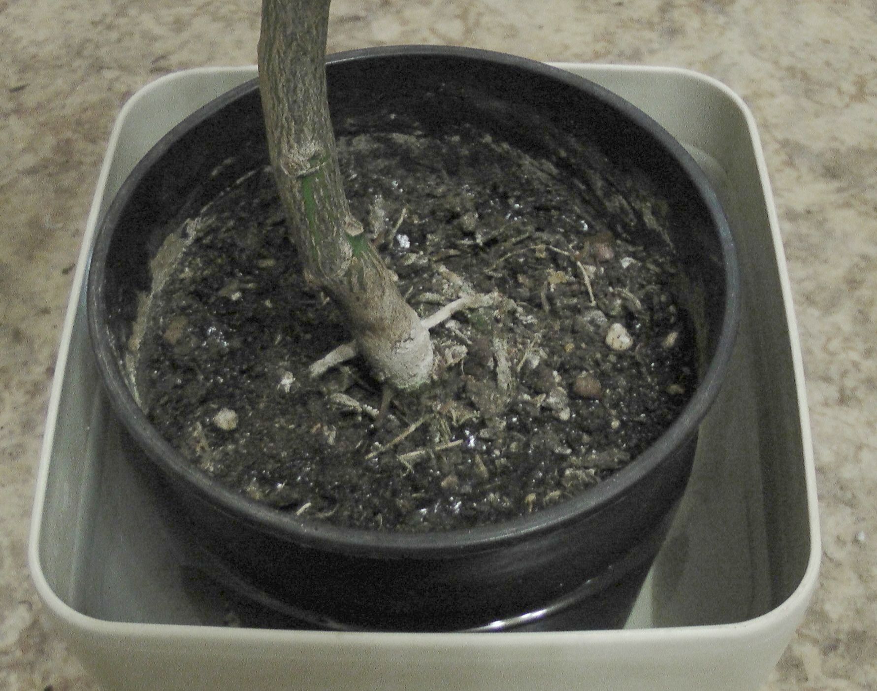 При сильной пересушке земляного кома горшок необходимо поставить на 2-3 часа в емкость с водой для полного пропитывания. Иначе вода при поливе будет стекать по стенкам горшка на поддон, а грунт останется сухим.